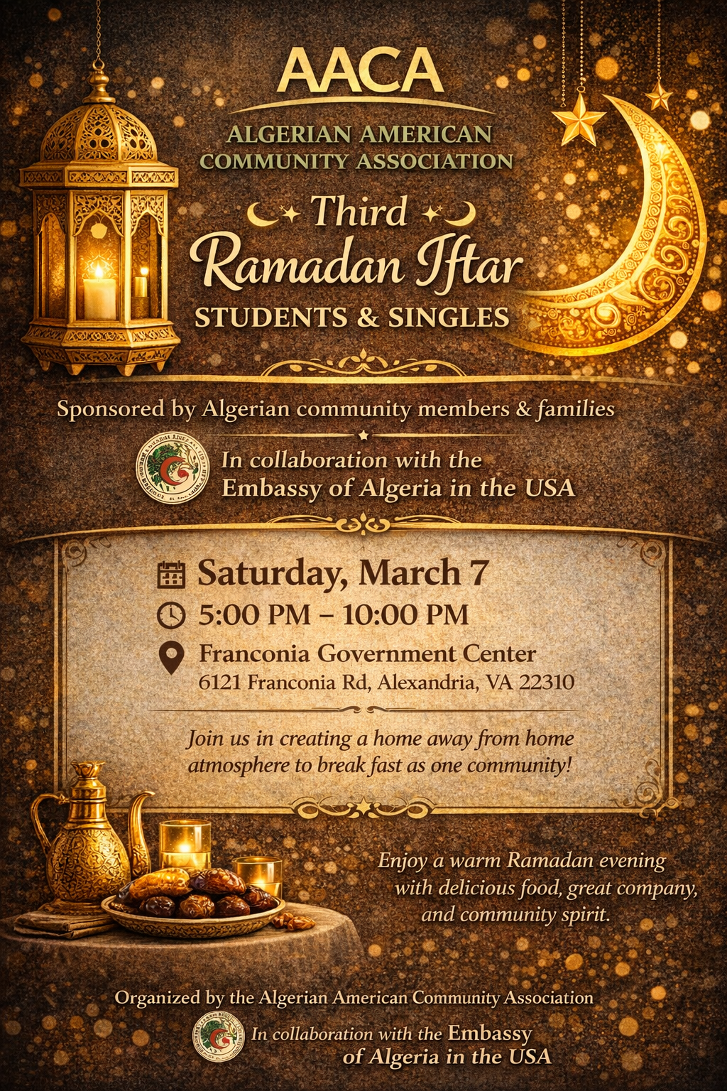The Algerian American Community Association warmly invites all students and singles to a special Ramadan Iftar dedicated just for you.